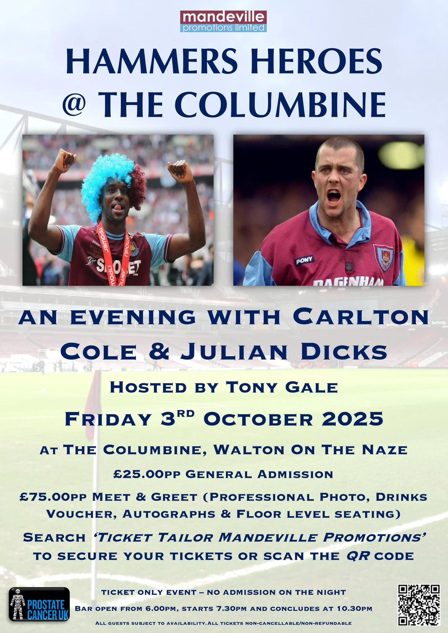 Back in 2001 Hammers fan Len Herbert started putting on events around Essex & London with various Ex Players, Len has put on and been involved in over 100 events including the famous ‘Pie & Mash’ night and back in 2016 Mandeville Promotions Ltd was launched.