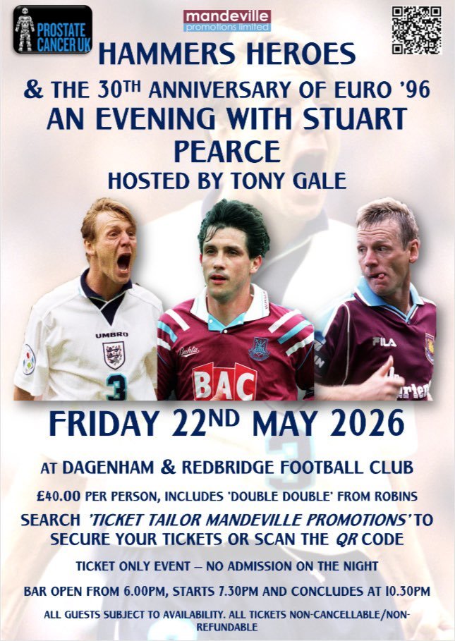 Ex Hammer Stuart Pearce will talk through his time at the club plus the 30th year since Euro 96. Tony Gale will host